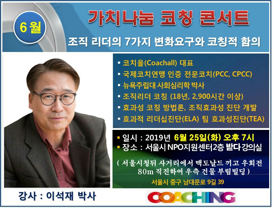 6/25 19:00 조직 리더의 7가지 변화요구와 코칭적 함의, 가치나눔코칭콘서트(회장 김희순 교수) 월례모임