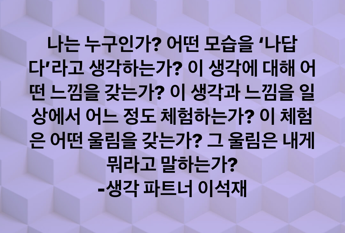 3. 코칭심리연구/코칭심리 탐구 Self-reflection의 시간 생각파트너 이석재 2019. 12. 7. 17:27 커피 한잔을 손에 들고 자기와 만남의 시간을 가져봅니다. 코치올, 생각 파트너 http://thinkingpartner.co.kr 저작자표시 비영리 변경금지 (새창열림)