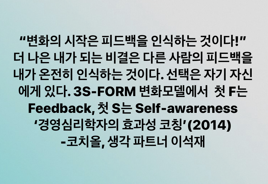 성장에는 좌절과 실패가 담겨 있다. 과거의 모습에 묶여있다면, 더 나은 나를 만드는 길로 가기 어렵다. 변화를 만들기 위해서는 심리적인 접근이 필요하다. 바로 다른 사람이 나를 어떻게 보고 있는지에 대한 정보와 내 스스로 자신을 어떻게 보고 있는지에 대한 정보, 두 정보간의 차이를 줄이는 것이다.