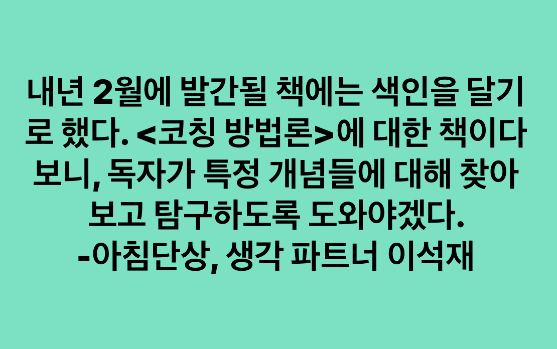 독자의 입장을 취해보고, 다시 저자의 입장이 되어 본다. 색인을 선정하는 과정에서 에너지가 쫘아악~ 빠져 나간다.