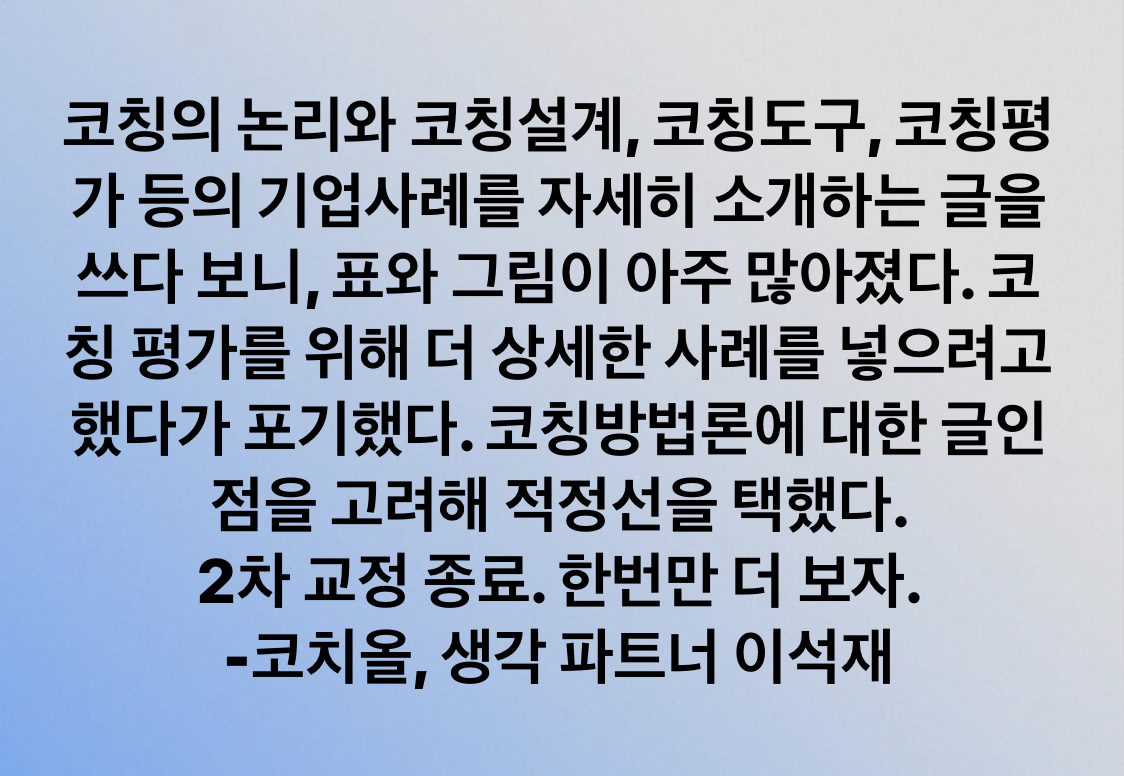 개인변화 사례, 팀변화 사례, 조직변화 사례... 그리고 이들을 연계하는 통합적 접근을 한 기업코칭 사례... 방법론 책 쓰기도 쉽지 않고, 교정도 큰 일이다. 오타는 다 찾았다. 또 보이겠지만... 여하튼 책에 담고 싶은 내용은 모두 포함시켰다. 여러 차례 반복해서 읽게 되면서 글이 눈에 익숙해지고, 오타를 찾기 어렵게 된다. 그러나 내용에 대해 더 깊게 생각하고 통합적으로 생각하게 되는 장점이 있다.