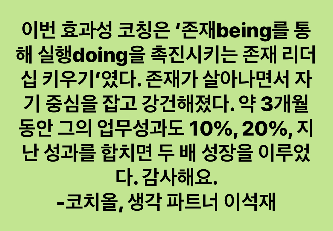 효과성 코칭의 접근 방식이며 코칭 리더십의 과제로서 존재를 통한 실행 촉진, 긍정성을 통해 생산성을 촉진시키기. 결과 중심, 성과 중심이 아닌 존재 중심, 인간 중심의 리더십. 계속 증거찾기, 올 해는 어느 때보다 증거기반코칭에 집중하기로!