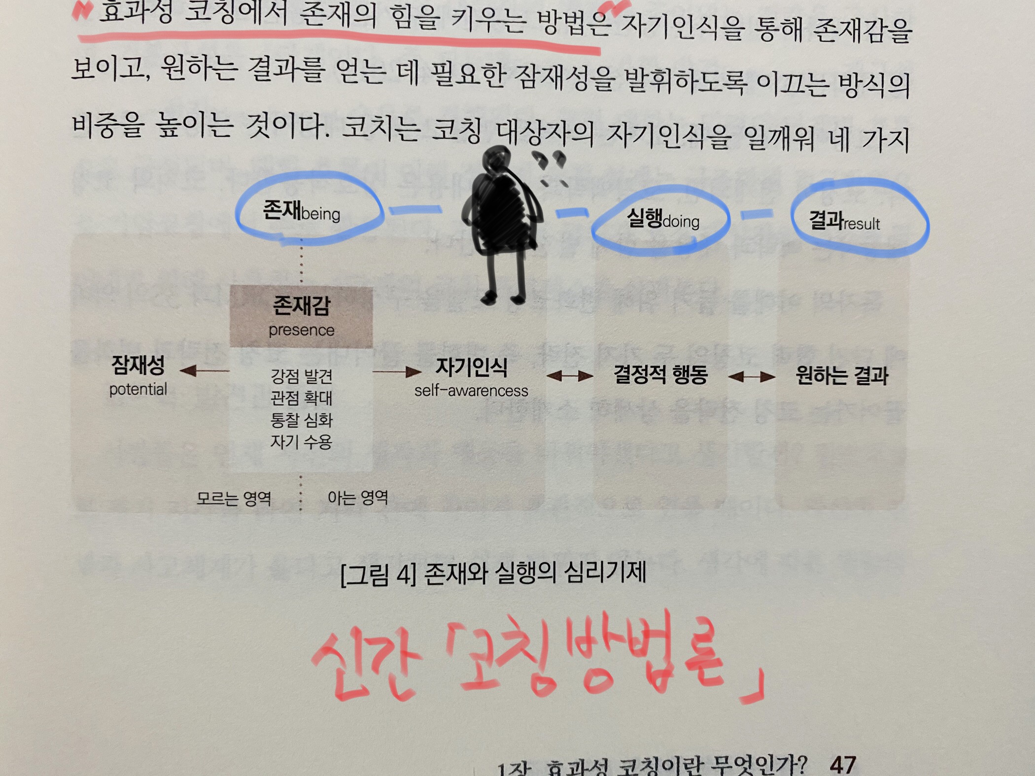 효과성 코칭 모델과 이론을 만들어 가는 과정에서 ‘존재’being와 ‘실행’doing의 관계를 개념화하는데 여러 해를 보냈습니다. 사회심리학자로서 존재감presence의 자리에 자기self 또는 자기존중감self-esteem을 대체할 수도 있지만, 코칭의 관점에서 존재감을 선택했습니다.