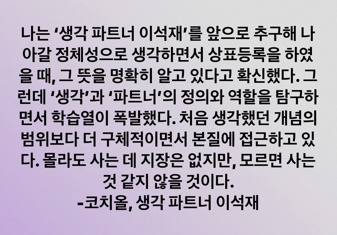 3. 코칭심리연구/코칭심리 탐구 질문을 던지고 답을 찾아 간다 생각파트너 이석재 2020. 3. 30. 17:41 내 삶의 후반전, 생각이라는 단어에 꽂히다. “질문을 던지고 답을 찾아 간다.” -코치올, 생각 파트너 이석재http://thinkingpartner.co.kr/?p=1630 저작자표시 비영리 변경금지 (새창열림)