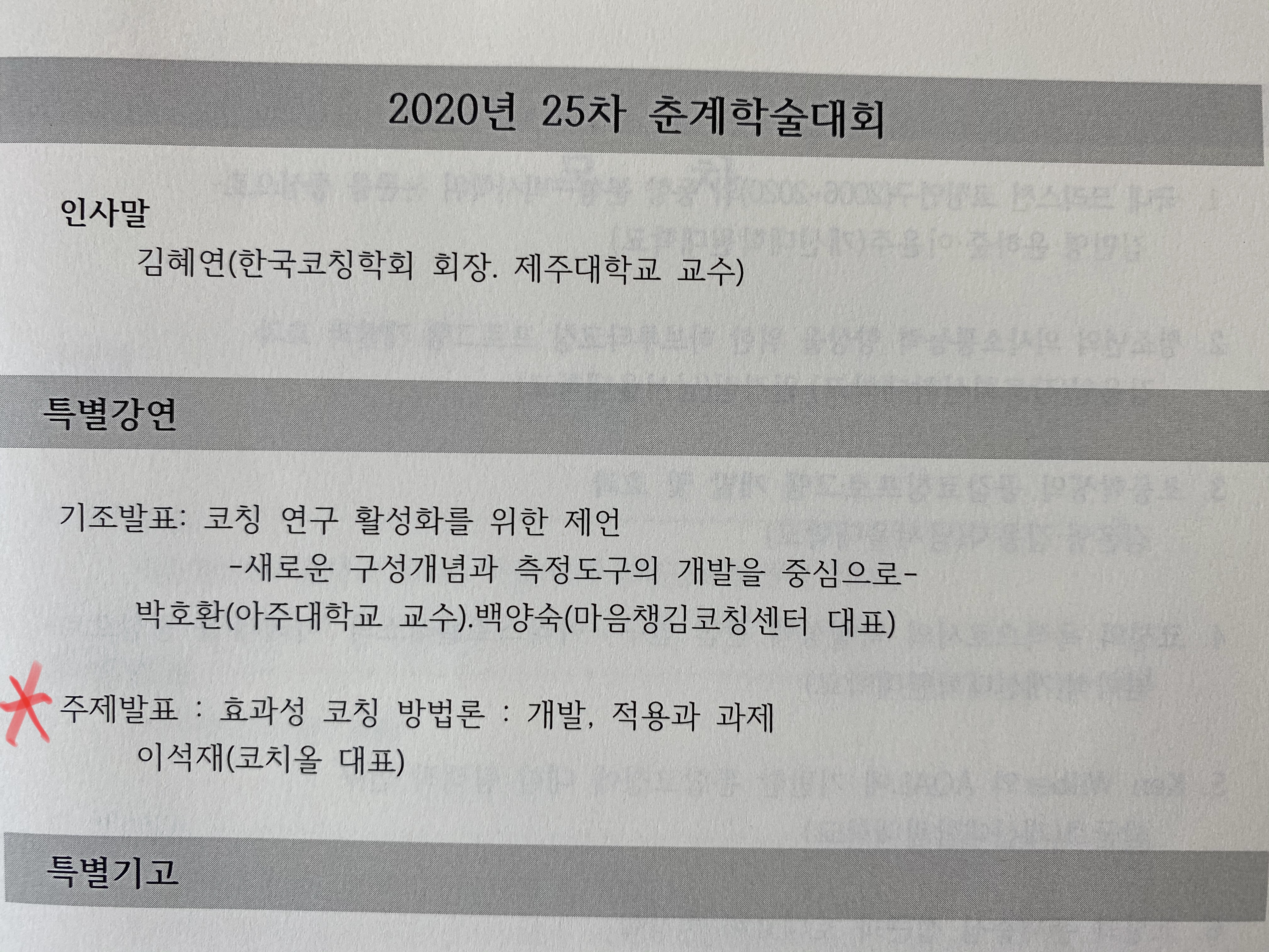 특별 강연의 주제 발표로 '효과성 코칭 방법론: 개발, 적용과 과제'의 내용을 첨부하였습니다.
