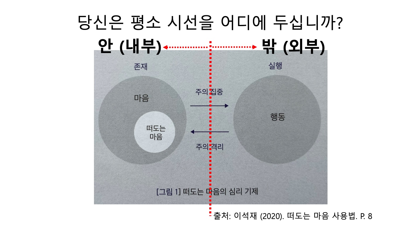 여러분은 평소 자신의 시선을 어디에 두고 있습니까? 성과와 평가적 사고가 팽배한 사회에서 사람들의 주의는 흔히 밖을 향하고 있습니다. 원하는 결과를 만드는 실행에 맞춰져 있습니다. 그래서 원하는 결과를 만드는 데 집중하는 사람들은 함께 일하는 사람들에게 "제대로 못하겠어?"라고 고함을 칩니다. 상대방이 겪을 마음의 상처, 자존감의 상실에 대한 관심은 부족합니다. 일 중심, 실행 중심의 삶을 사는 사람들은 떠도는 마음을 비생산적인 마음이라고 생각합니다. 한마디로 잡생각이라고 봅니다. 사람들이 흔히 가지고 있는 통념입니다. 실행을 방해하기 때문이지요. "홍길동님, 잡생각 때려치시오. 일에 전념하라고 했지 엉뚱한 생각에 시간 낭비하라고 했어요?"라고 상대방의 떠도는 마음에 따른 생각을 평가절하합니다. 떠도는 마음은 정말 비생산적인 것일까요?