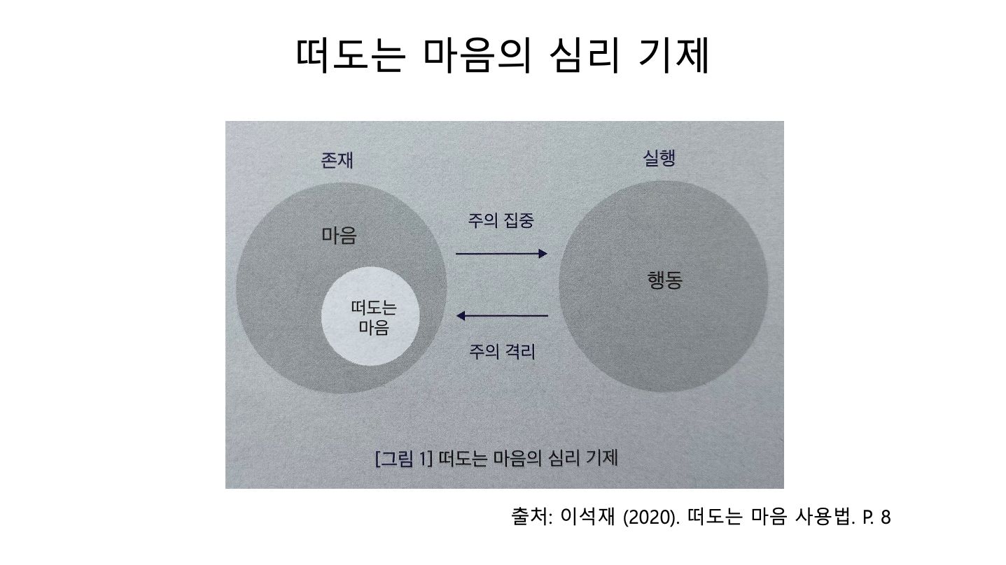 어제(2020.12.23) 저녁에 Zoom으로 2020을 마무리하고 2021년을 맞이하는 특강을 진행했습니다. 주요 내용을 공유합니다. 떠도는 마음이란, '일에 대한 집중력이 떨어진 사람들의 주의가 그들의 내면으로 이동하면서 생기는 자발적인 정신 상태입니다.' 떠도는 마음은 마음의 일부입니다.