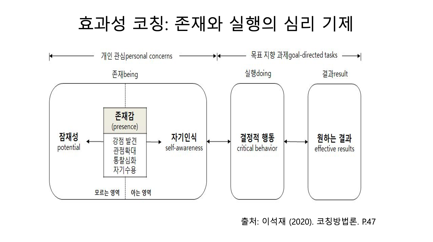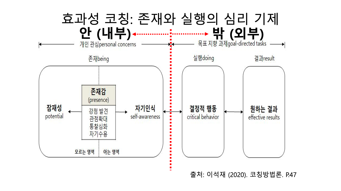 나는 '효과성 코칭'을 개발하고 발전시키면서 떠도는 마음에 대해 관심을 가졌습니다. 효과성 코칭은 원하는 결과를 얻을 가능성을 높이는 협력 코칭입니다. 원하는 결과를 얻을 가능성을 높이는 행동을 하는 것은 목표지향적 사고입니다. 우리가 외부 요구에 충실할 때 흔히 취할 가능성이 높은 것이지요. 이때 우리가 놓치기 쉬운 것은 무엇일까요? 바로 존재에 대한 관심입니다. 사람들이 원하는 결과에 집중하면서 자신의 내면에서 일어나는 내적 요구, 개인 관심을 쉽게 무시합니다. 효과성 코칭에서 강조하고 싶은 것은 바로 개인 관심이 원하는 결과를 얻는 데 중요한 생산적인 자원으로 활용되어야 한다는 것입니다.