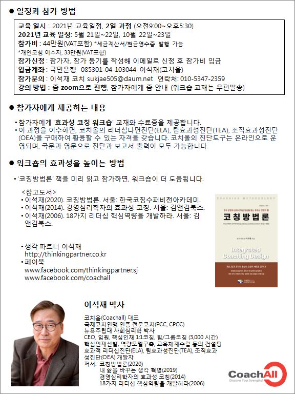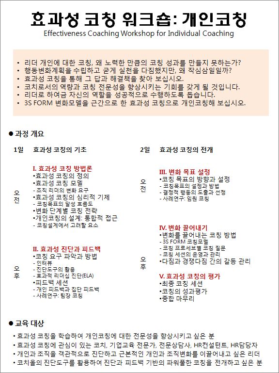 지난 2015년부터 진행한 '효과성 코칭 워크숍: 개인코칭'을 온라인으로 진행합니다. 개인코칭은 3S-FORM코칭모델(행동변화모델)과 리더십진단도구(ELA)를 활용한 진단기반의 접근을 사용합니다. 오프라인으로 진행하는 것을 고집하다가, 줌zoom으로 진행하기로 결정했습니다. 2021년 워크숍 일정에 따라서 진행합니다. 첨부한 안내문을 참고바랍니다. 올해 2월 과정은 폐강하고,