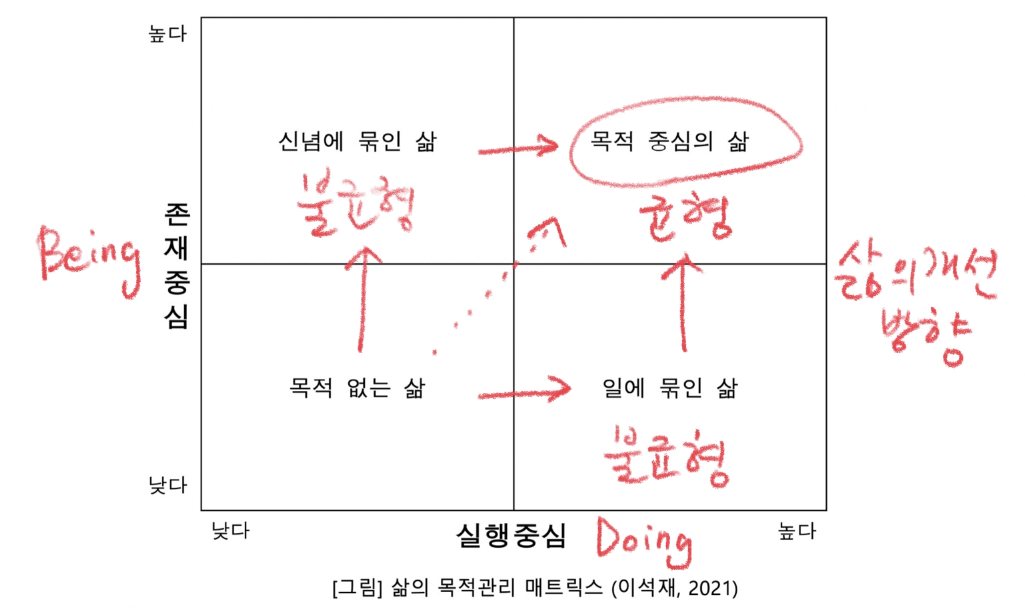 자기 자신이 더 나아기지 위해서는 먼저 삶의 목적관리 메트릭스로 원하는 삶을 디자인한다. 목적 없는 삶, 일에 묶인 삶을 경계하는 것이 중요하다. 효과성 코칭에서 코치는 존재 중심(being)과 실행 중심(doing)의 삶이 균형 잡히고, 존재가 실행을 촉진시키는 삶을 추구한다. 그러나 삶의 목적에 묶이지 말자!