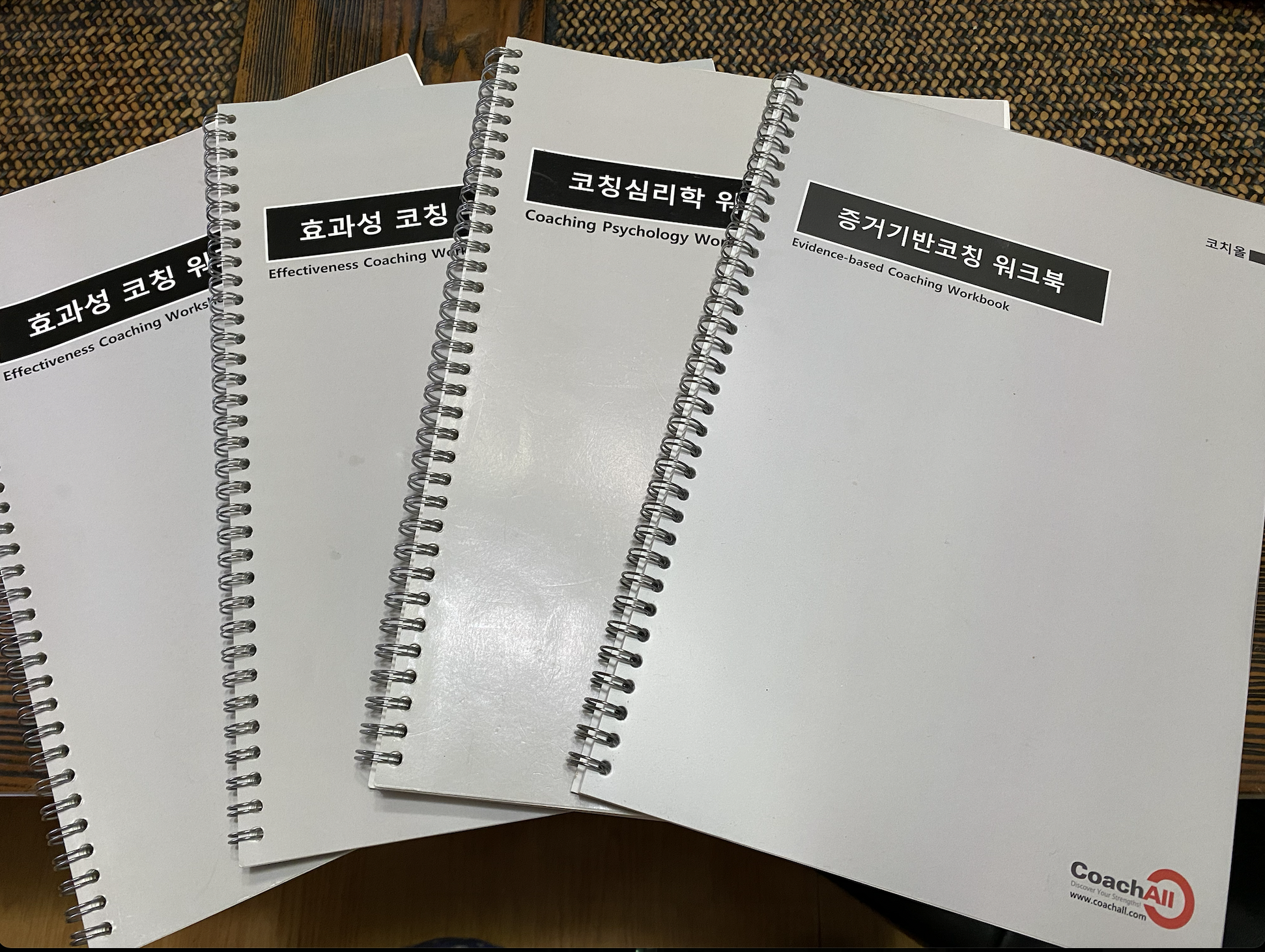 이제 워크북workbook이 4가지입니다. 증거기반코칭 워크북, 코칭심리학 워크북, 효과성 코칭 워크숍(개인코칭), 효과성 코칭 워크숍(조직코칭). 2022년에는 두 가지가 더 추가되죠. 바로 코칭방법론 워크북, OOOO코칭 워크북입니다. 코칭방법론 워크북은 거의 만들었고, 나머지를 만들어야 합니다. 내년에는 총 6개의 워크북으로 공부를 합니다.