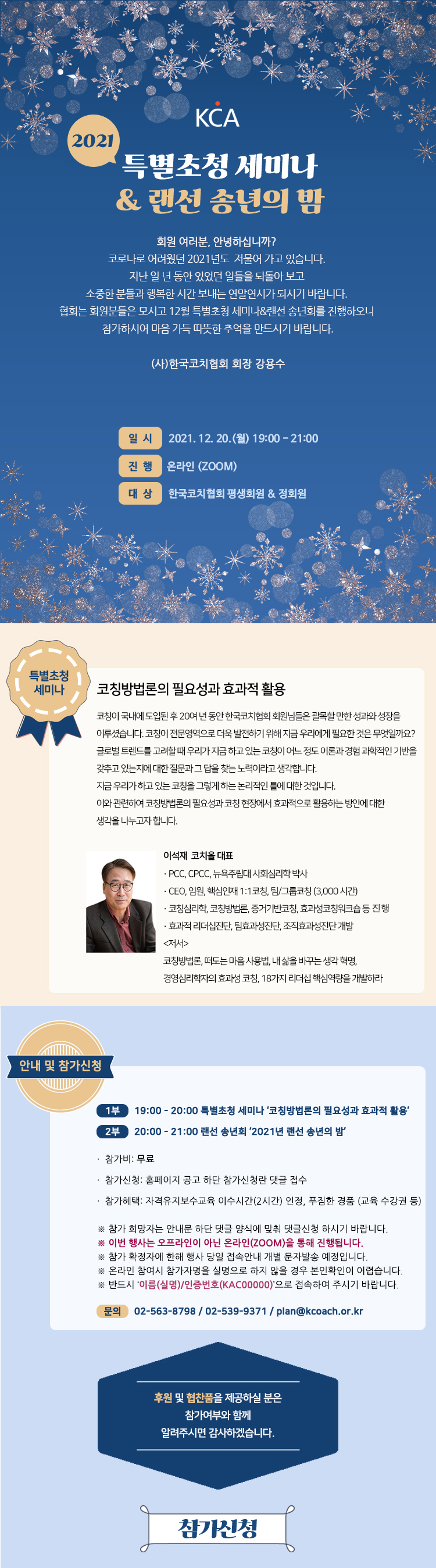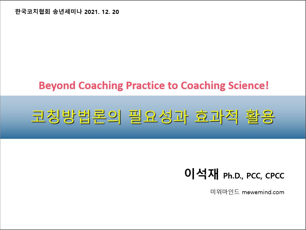 한국코치협회 송년회가 오미크론으로 인해 줌zoom으로 진행됩니다. 귀한 시간에 세미나를 진행합니다. 제목은 ‘코칭방법론의 필요성과 효과적 활용’입니다. 세미나에서는 방법론을 코칭에 적용한다는 의미와 필요성, 적용할 때의 기본 절차와 사례를 통해 코칭방법론을 적용하지 않을 때와의 차이를 생각하고 토의하는 시간을 갖도록 할 계획입니다.