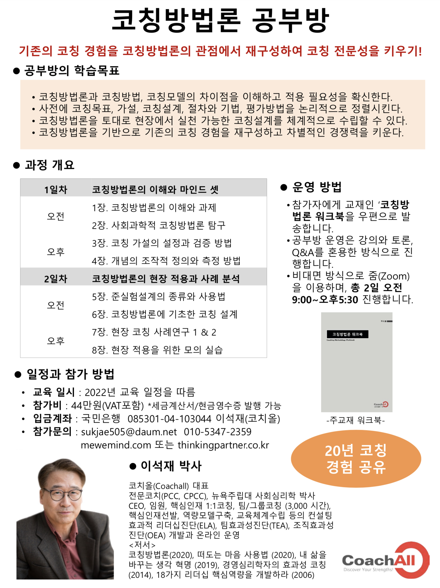 2022년 1월 21일-22일 (9:00~17:30), 기존의 코칭을 코칭방법론의 관점에서 재구성해 보십시오. 코칭방법론에 따른 코칭전략과 코칭설계를 전개해 보는 것이죠. 코칭방법론은 학술적인 활동 뿐만이 아니라 코치로서의 전문성과 차별적인 개인 브랜딩, 시장 경쟁력을 만드는 지름길입니다. "코칭이란 무엇인가?"에 대한 자기만의 답을 찾는 길이며, 곧 코치로서의 정체성을 명확하게 만드는 방법이죠.