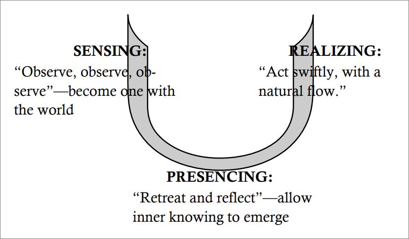 저자는 구체적인 방법으로 U 이론을 제시했다. U 이론은 3가지 과정으로 구성된다. 먼저 U의 왼쪽에서 시작하는 감각(sensing), U의 가장 밑바닥에 있는 현존(presencing), 마지막으로 오른쪽 끝에 있는 실현(realizing)이다.