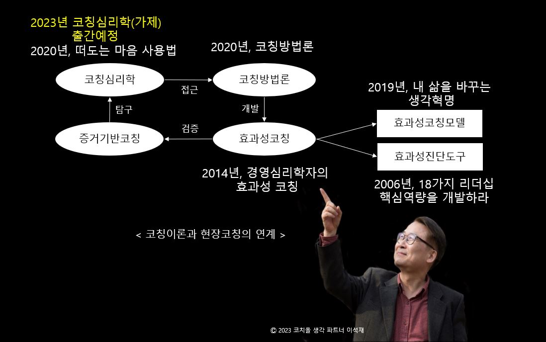 2014년 ‘경영심리학자의 효과성 코칭’을 출간할 때 꼭 쓰고 싶은 책이 있었죠. 바로 이번에 출간하는 ‘코칭심리학’(가제)입니다. 효과성 코칭은 코칭 현장에서 수집한 자료를 토대로 귀납적 접근을 했죠. 이번 책은 코칭심리학 이론을 분석하는 연역적 접근을 했습니다. 코칭심리학 책을 쓰기까지 많은 시간을 투자했습니다. 코치로 활동한 지난 20년의 코칭 경험이 녹아있습니다. 앞으로 4~5개월은 코칭심리학(가제) 편집과 발간에 집중하려고 합니다.